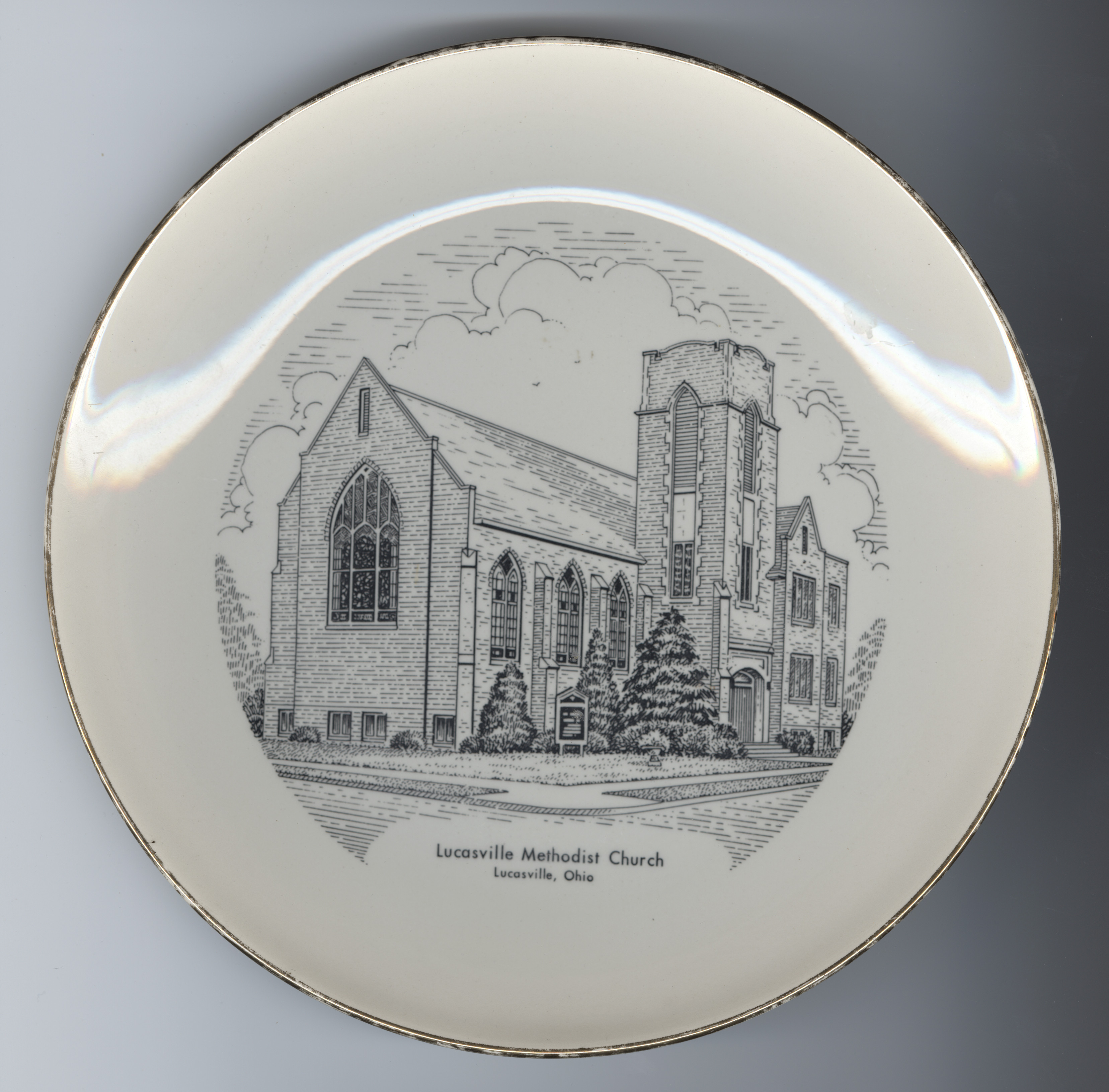 - White ceramic plate with black print and gold edging. Black image of the Lucasville Methodist Church is printed on the front. The Church's history is printed on the back of the plate in black font.