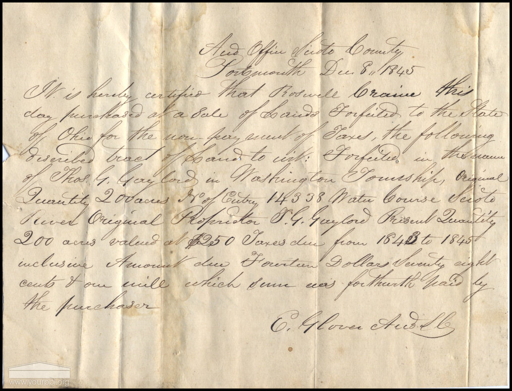 Scioto County Auditor's Office, “Auditor's Office, Scioto County, Portsmouth, December 8, 1845,” Scioto County Public Library Local History Digital Collection, accessed December 5, 2025, https://www.sciotolibrary.org/history/items/show/3256.