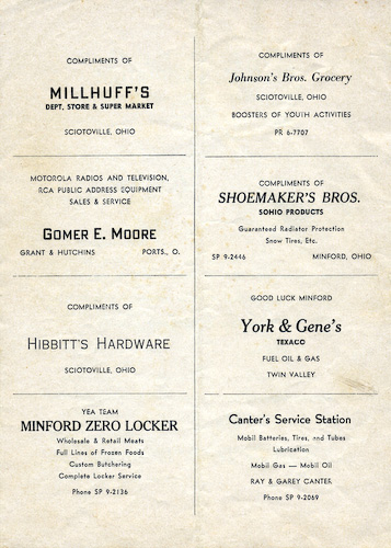- Advertisement page in the official football program, Notre Dame vs. Minford Falcons.