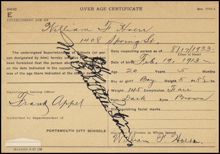Portsmouth City Schools, “Over Age Certificate,” Scioto County Public Library Local History Digital Collection, accessed December 5, 2025, https://www.sciotolibrary.org/history/items/show/3397.