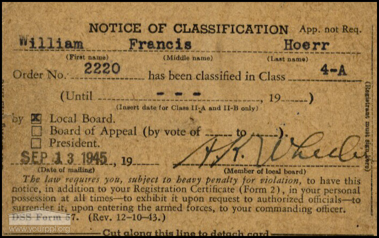 - During the years of WWII, a Class 4-A meant: "Registrant who has completed service; or sole surviving son". Issued through the Selective Training and Service Act of 1940. scanned image of Notice card for William Francis Hoerr.