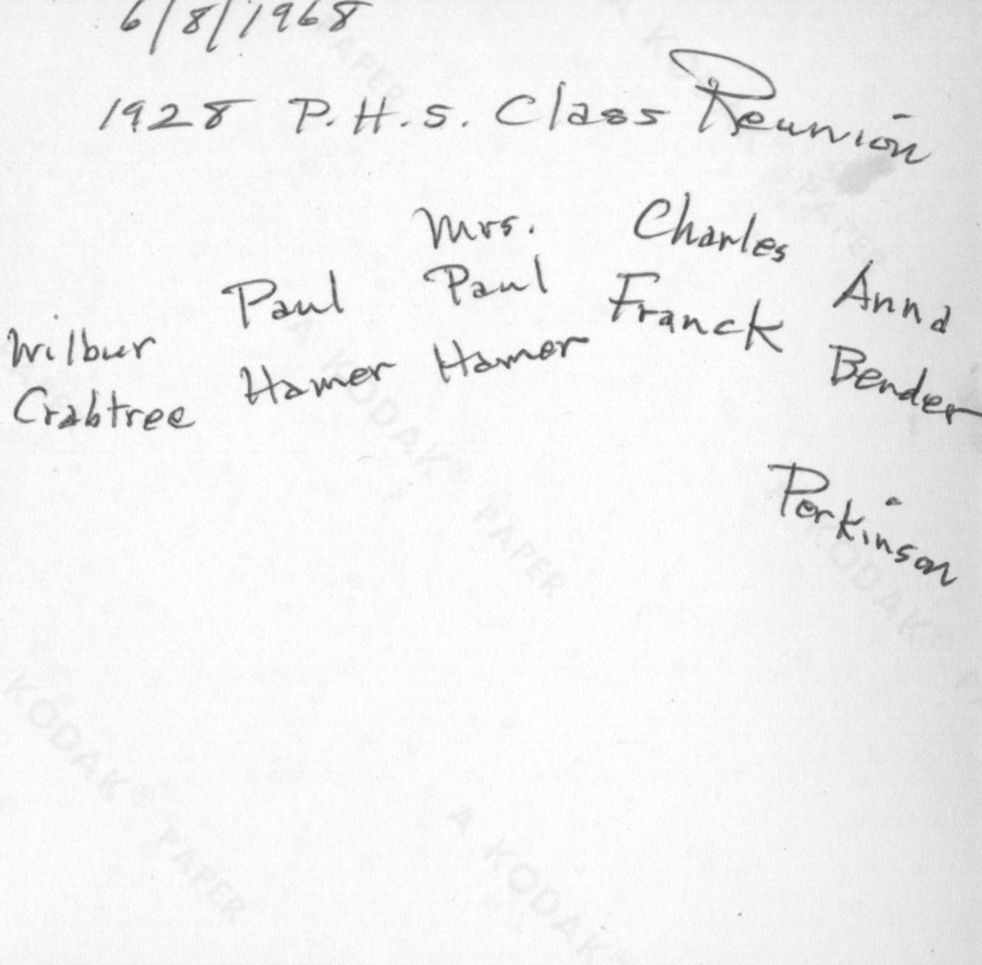 - Black and white photo image of members of the Portsmouth High School class of 1928 at the class reunion on June 7, 1968. Pictured are Wilbur Crabtree, Paul Hamer, Mrs. Paul Hamer, Charles Franck, Anna Bender Perkison