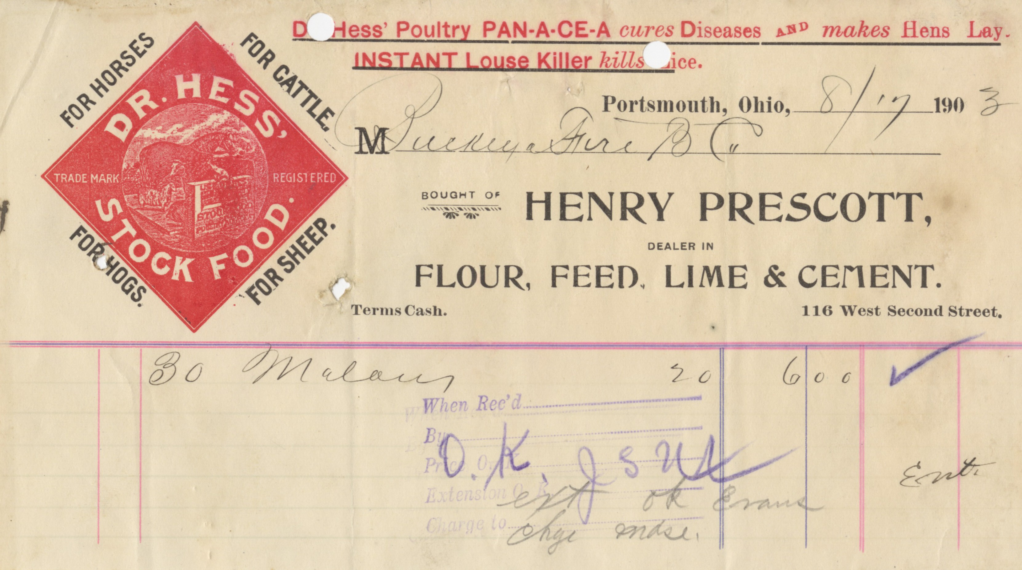 Unknown, “Henry Prescott Flour, Feed, Lime, and Cement Invoice,” Scioto County Public Library Local History Digital Collection, accessed December 5, 2025, https://www.sciotolibrary.org/history/items/show/4575.