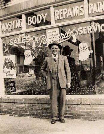 - Black & white photo of Karl Wasserman in front of his Packard Garage