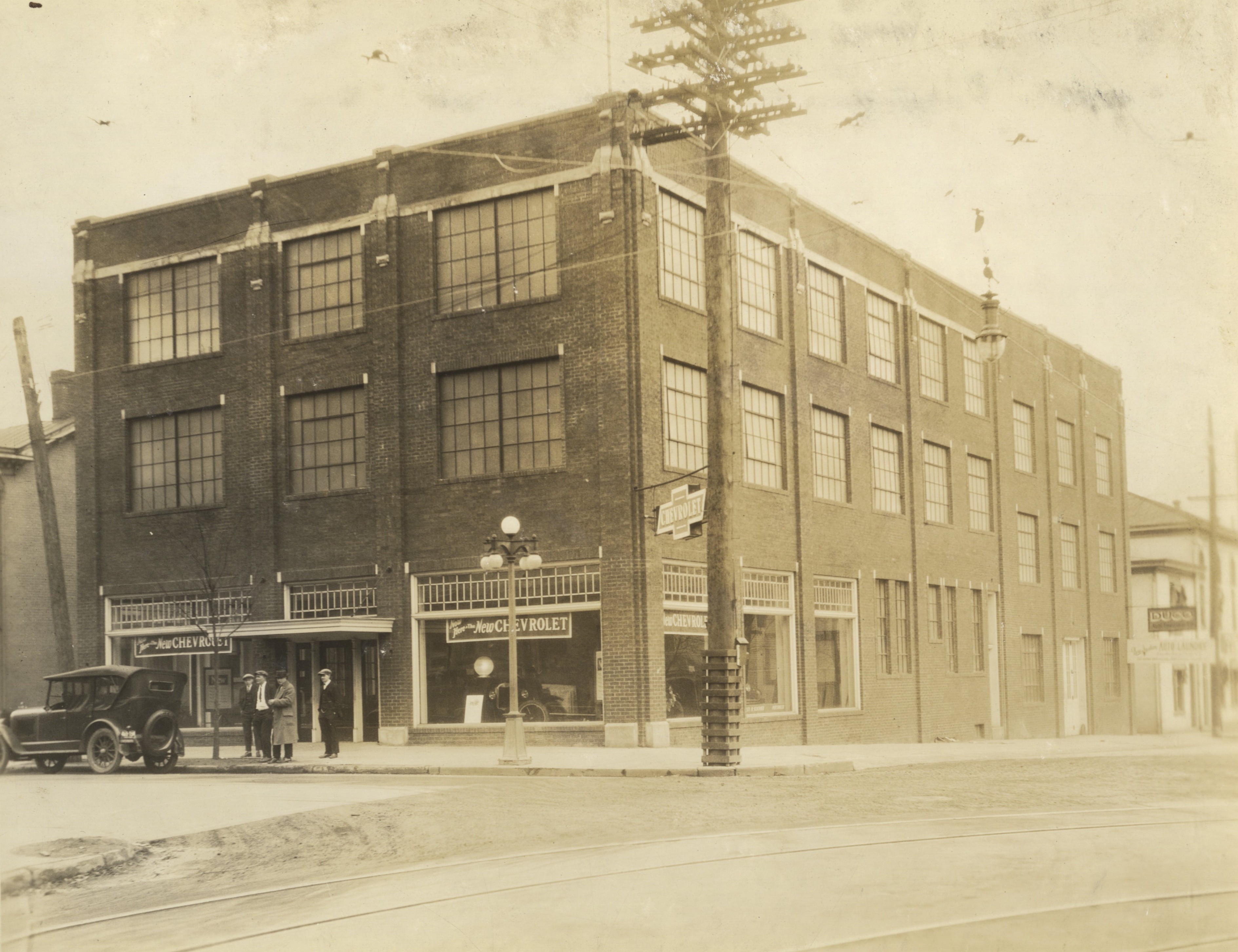 - Black and white photo image of Glockner Chevrolet-Chevrolet Motor Cars dealership, built in 1923. Architects Devoss and Donaldson, Contractors R. L Hopkins Trimmed with McDermott Blue Stone Furnished by the Taylor Stone Company.