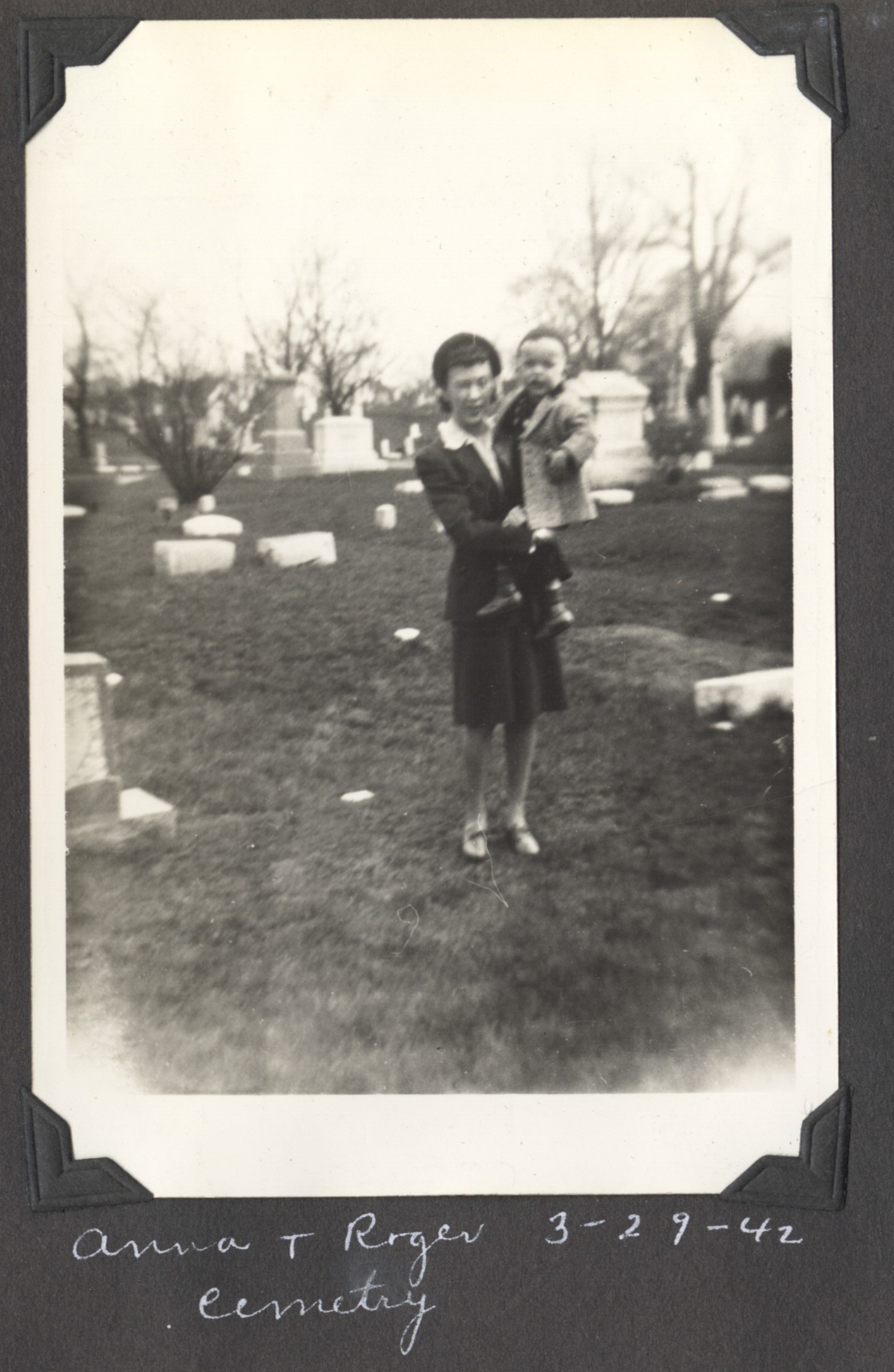 - Black & white photograph in Barber family scrapbook. "Anna & Roger in cemetery"