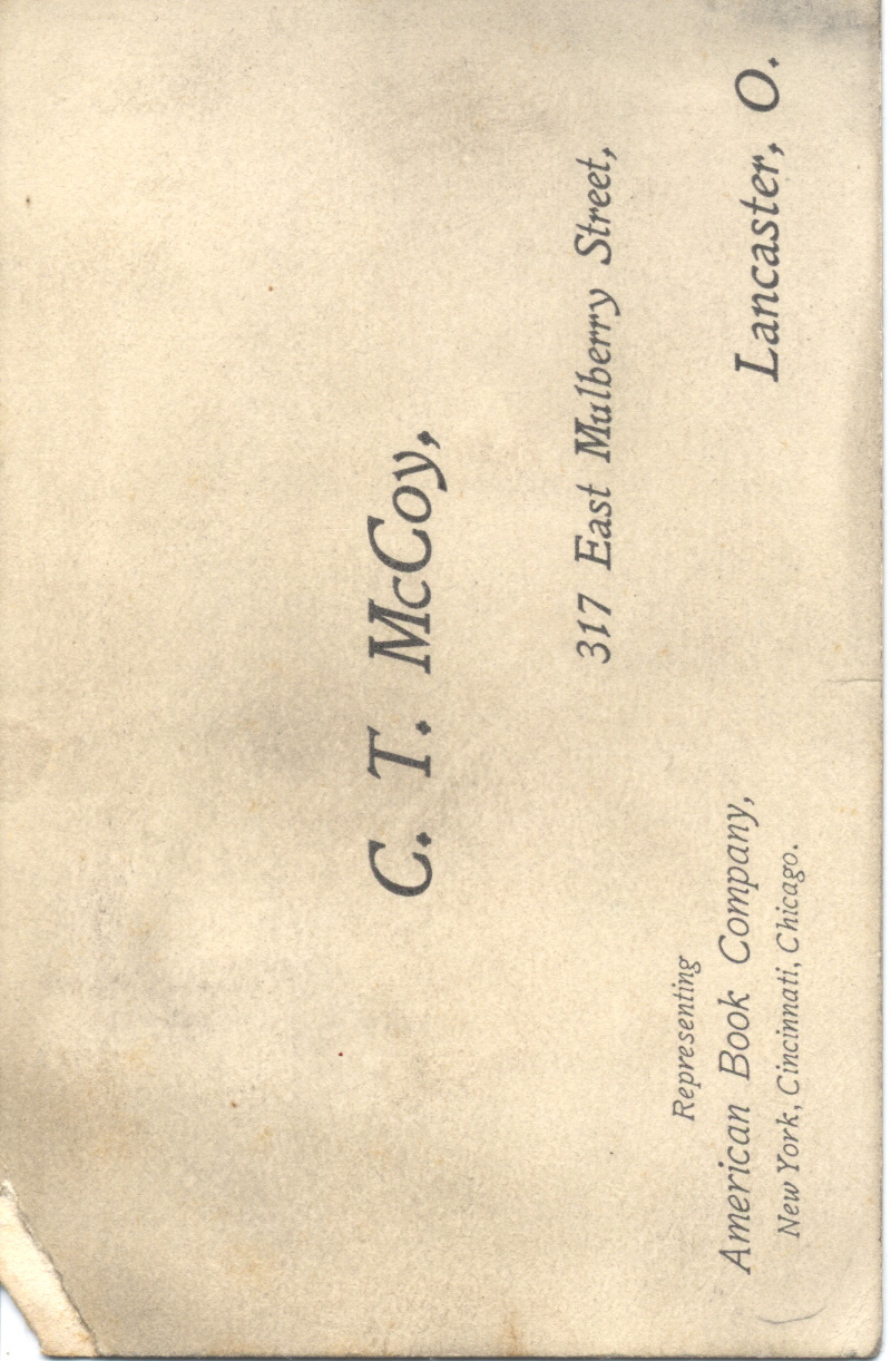 - Business card of C.T. McCoy of 317 East Mulberry Street, Lancaster, O. representing American Book Company, New York, Cincinnati, and Chicago