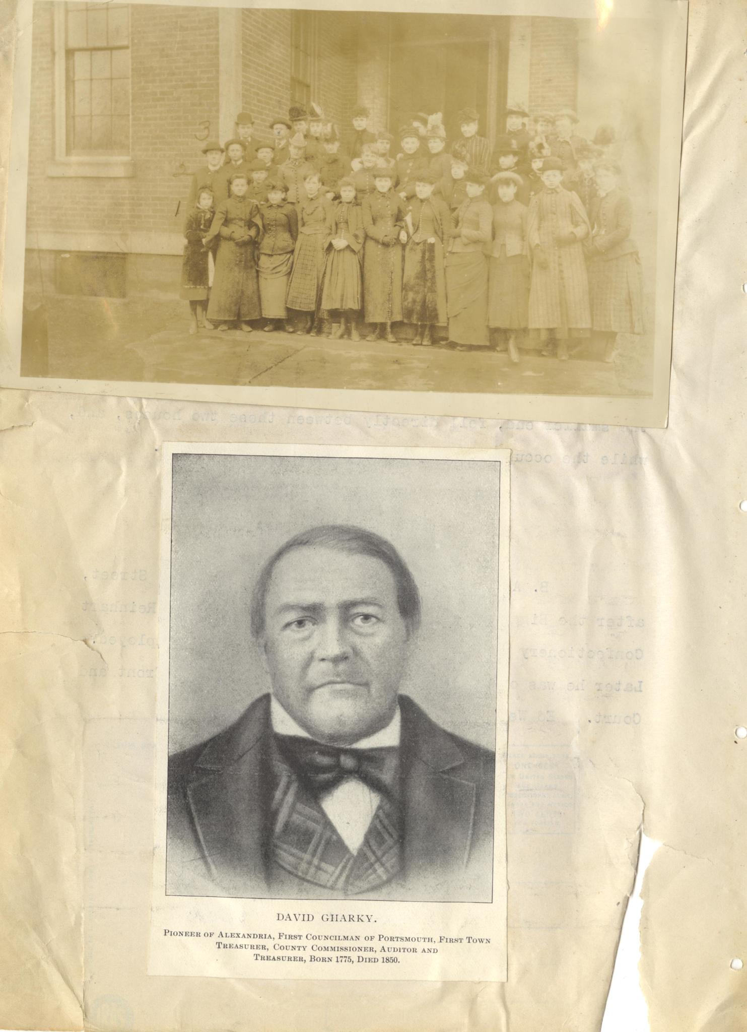 Scanned unnumbered page from Henry A. Lorberg scrapbook containing black & white image of 6 unidentified men and a City of Portsmouth Resolution of thanks to H.A. Lorberg for his help in securing a donation for Andrew Carnegie to build the Portsmouth City Library.