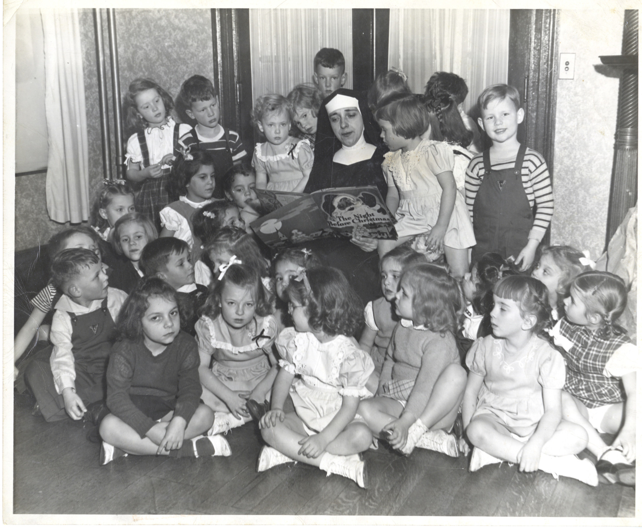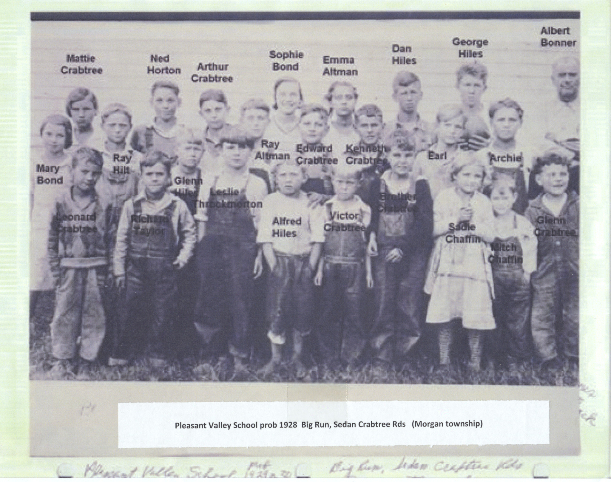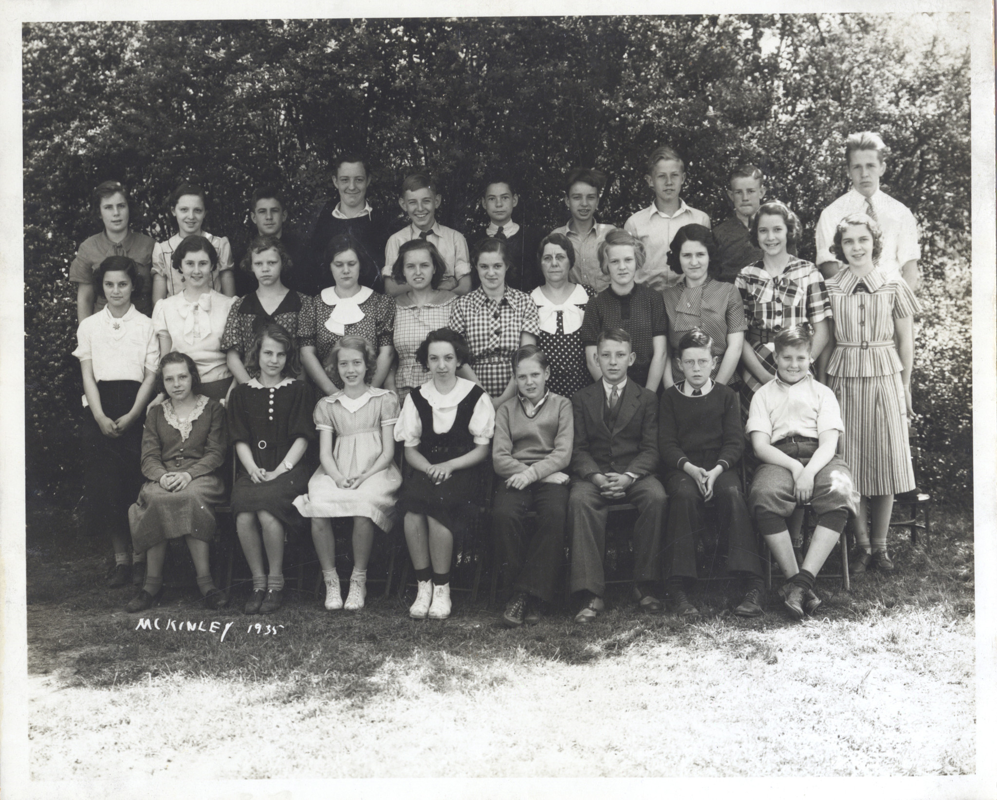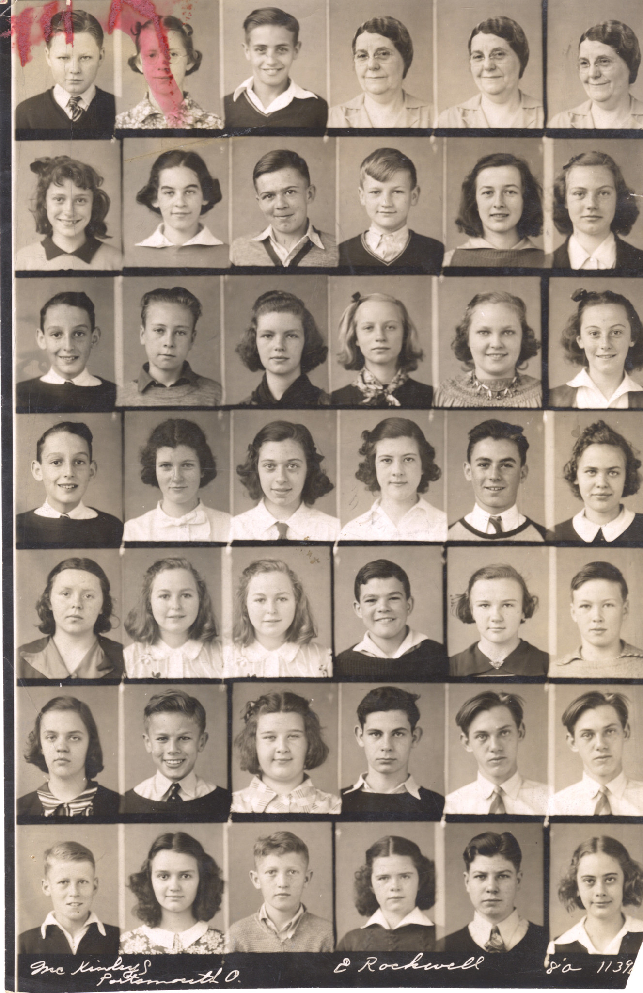 Students L-R: 1st row- Margaret White, Regina Browning, David Smith, ?, Harry Woodword, Donnie Freshour, ?, Rosemary Saunders, Rebecca White. 2nd row- Pauline Oakley, Lee ?, Howard Wolery, Betty Lipker, ?, George Hedges, ?, Neal Wykoff. 3rd row- ?, Miss West, ?, Mabel ?, Bob Livingston, Louise Haws, Mina Jo Bauer, Charles Thompson. 4th row- ?, Russell Ketter, ?, Joyce Ann Harris.