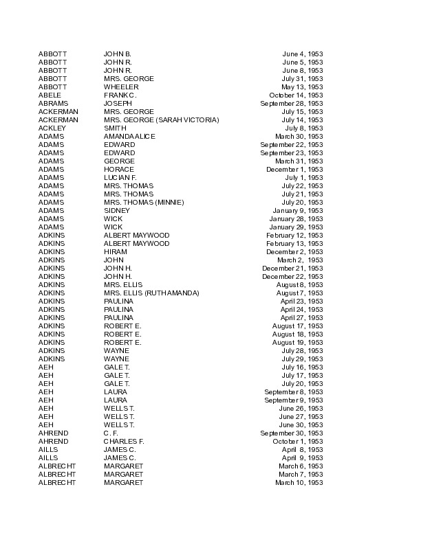 Black print in chart with last name, first name, date that obituary fell on in the Portsmouth Daily Times, and sometimes page number in red.