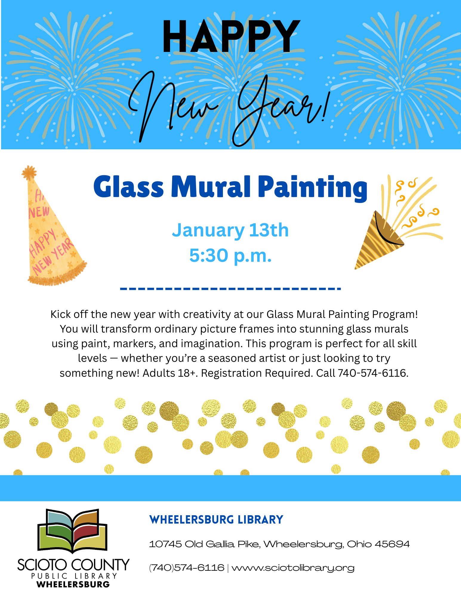 Wheelersburg Library 10745 Old Gallia Pike, Wheelersburg, OH, United StatesKick off the new year with creativity at our Glass Mural Painting Program! You will transform ordinary picture frames into stunning glass murals using paint, markers, and imagination.