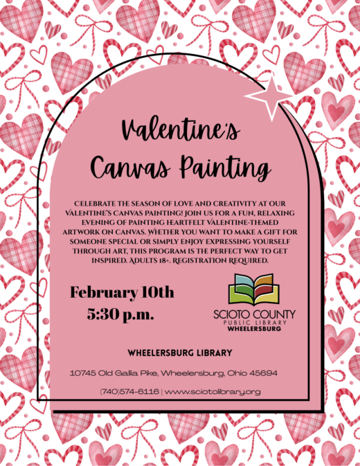We will be hosting Painter’s choice. There are several options of items available to choose. The class begins at 5:30 p.m. There will be limited available seating, please stop in to pre-register, for more information, call the South Webster Branch Library at 740- 778-2122