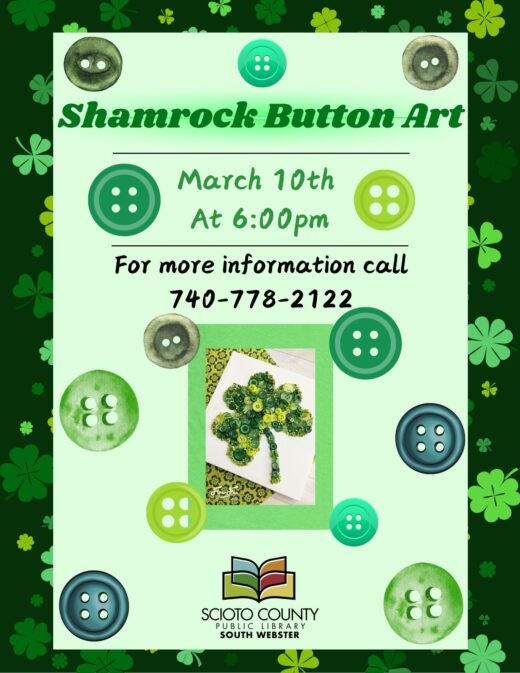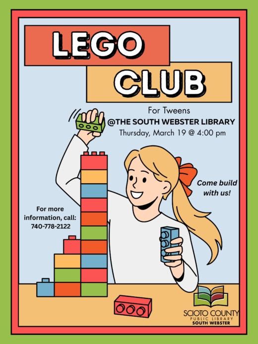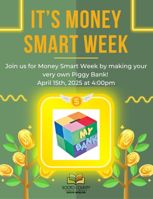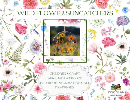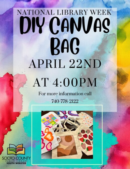 Children’s craft at 4:00pm. National Library Week –Come to the South Webster Library and create your very own Canvas Library Bag! All supplies provided. For more information, call the South Webster Branch Library at 740-778-2122.