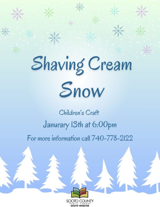 Children’s craft at 6:00pm. Shaving Cream Snow – Join us at the South Webster library to make some Shaving Cream Snow that you won’t need mittens for! All supplies provided. For more information, call the South Webster Branch Library at 740-778-2122.