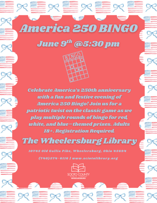Celebrate America’s 250th anniversary with a fun and festive evening of America 250 Bingo! Join us for a patriotic twist on the classic game as we play multiple rounds of bingo for red, white, and blue–themed prizes. Adults 18+. Registration Required.