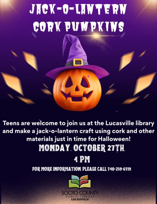 Teens are welcome to join us at the Lucasville library on Monday, October 27th at 4pm for a Jack-o-lantern Cork Pumpkin craft. We will be gluing corks together in a pumpkin shape, adding paint, and using markers to create the face during this fun Halloween activity! For more information, call...
