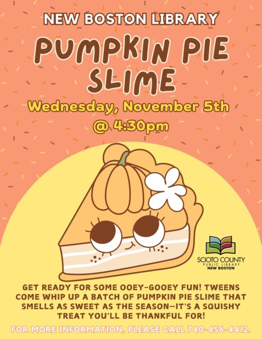 Join us as we create a delightful pumpkin pie slime that’s perfect for the season and something you’ll be thankful for! For more information, please call 740-456-4412.