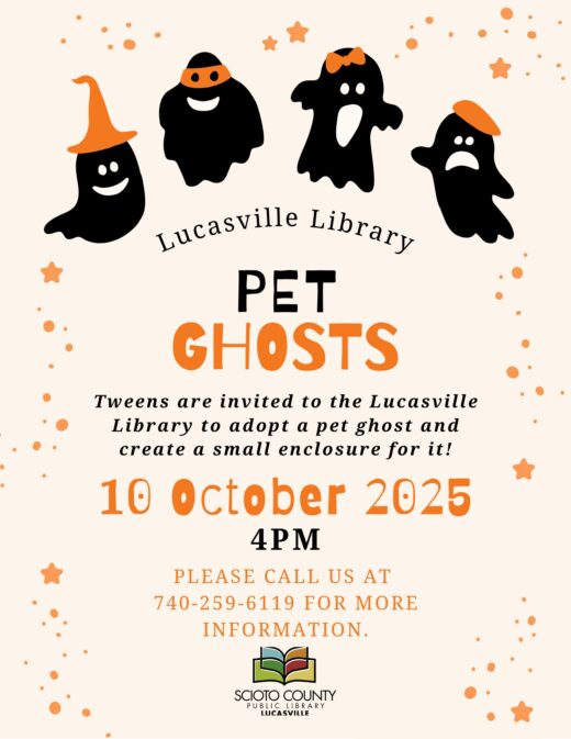 Tweens are invited to the Lucasville Library to adopt a friendly pet ghost! Choose your new phantom friend and customize an enclosure for them to haunt! This program will take place on Friday, October 10th at 4PM. For more information, please call us at 740-259-6119.