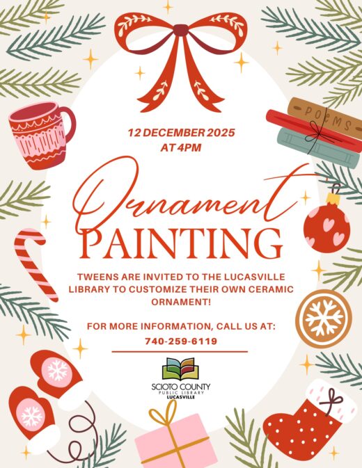 Tweens are invited to celebrate the holiday season at the Lucasville Library with ceramic ornament decorating! Choose from 6 different festive figurines and customize it however you like. This program will take place on Friday, December 12th at 4PM. For more information, please call us at 740-259-6119.