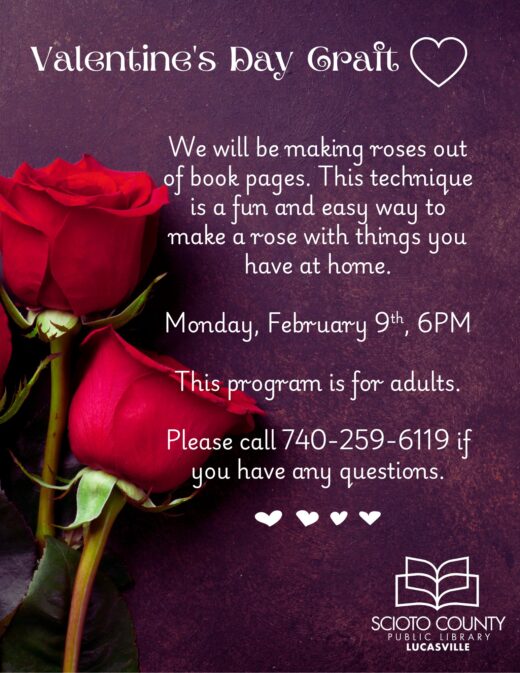 Adults are welcome to join us at the Lucasville Library on Monday, February 9th at 6pm for a Valentine’s Day craft! Those in attendance will be learning the technique of how to make roses out of book pages. For more information, please call 740-259-6119.