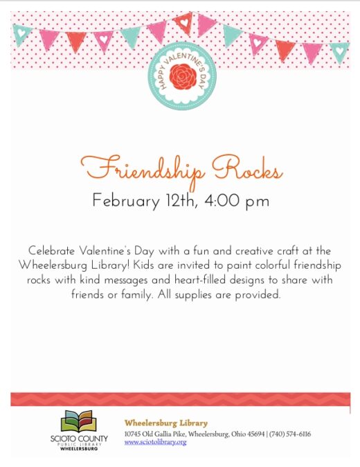 Celebrate Valentine’s Day with a fun and creative craft at the Wheelersburg Library! Kids are invited to paint colorful friendship rocks with kind messages and heart-filled designs to share with friends or family.