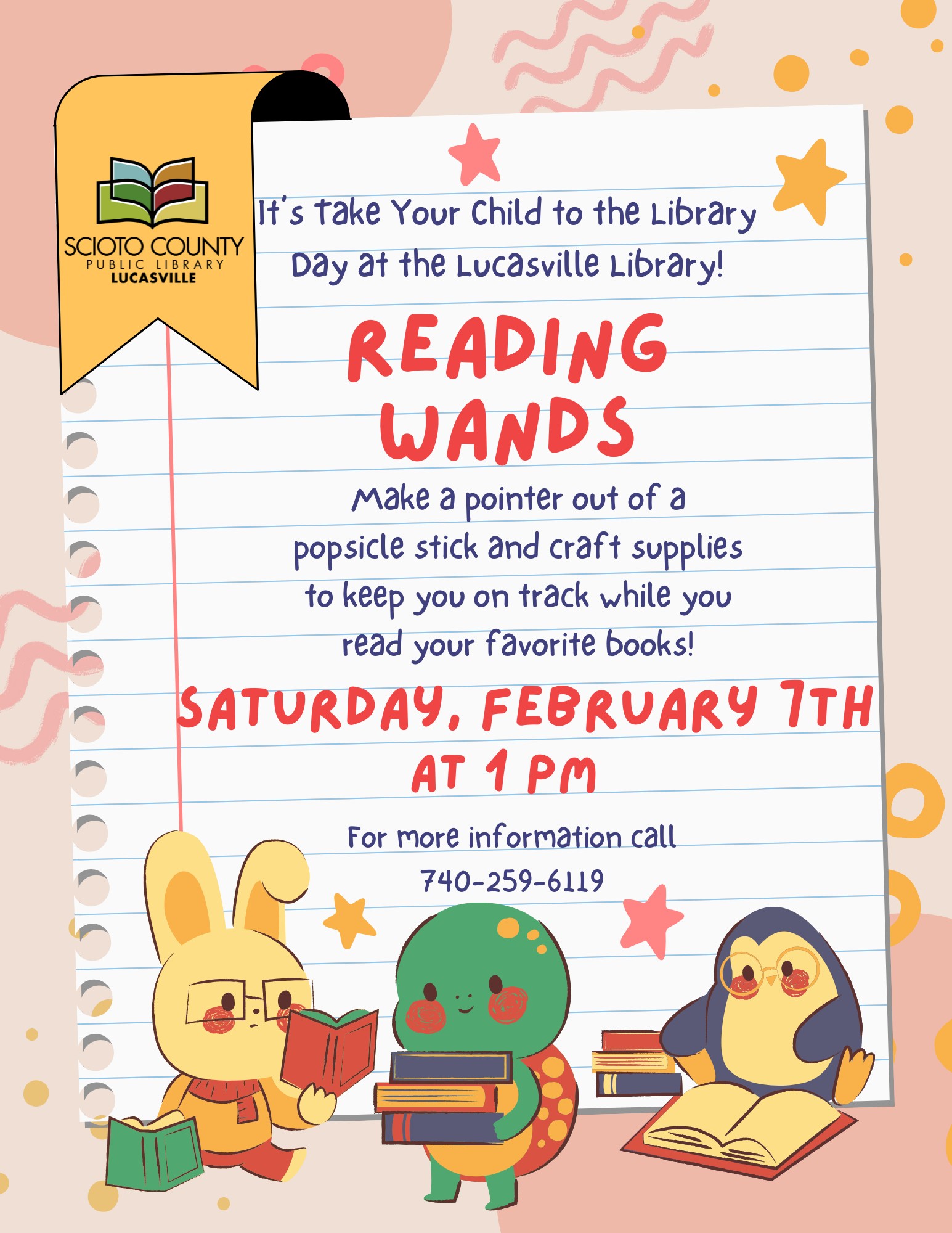 Lucasville Library 103 State Route 728, Lucasville, OH, United StatesChildren are welcome to join us at the Lucasville Library on Saturday, February 7th at 1pm to celebrate Take Your Child to the Library Day! Kids will have the chance to create their own pointer for when they are reading. Using a popsicle stick and miscellaneous decorations, they will make...