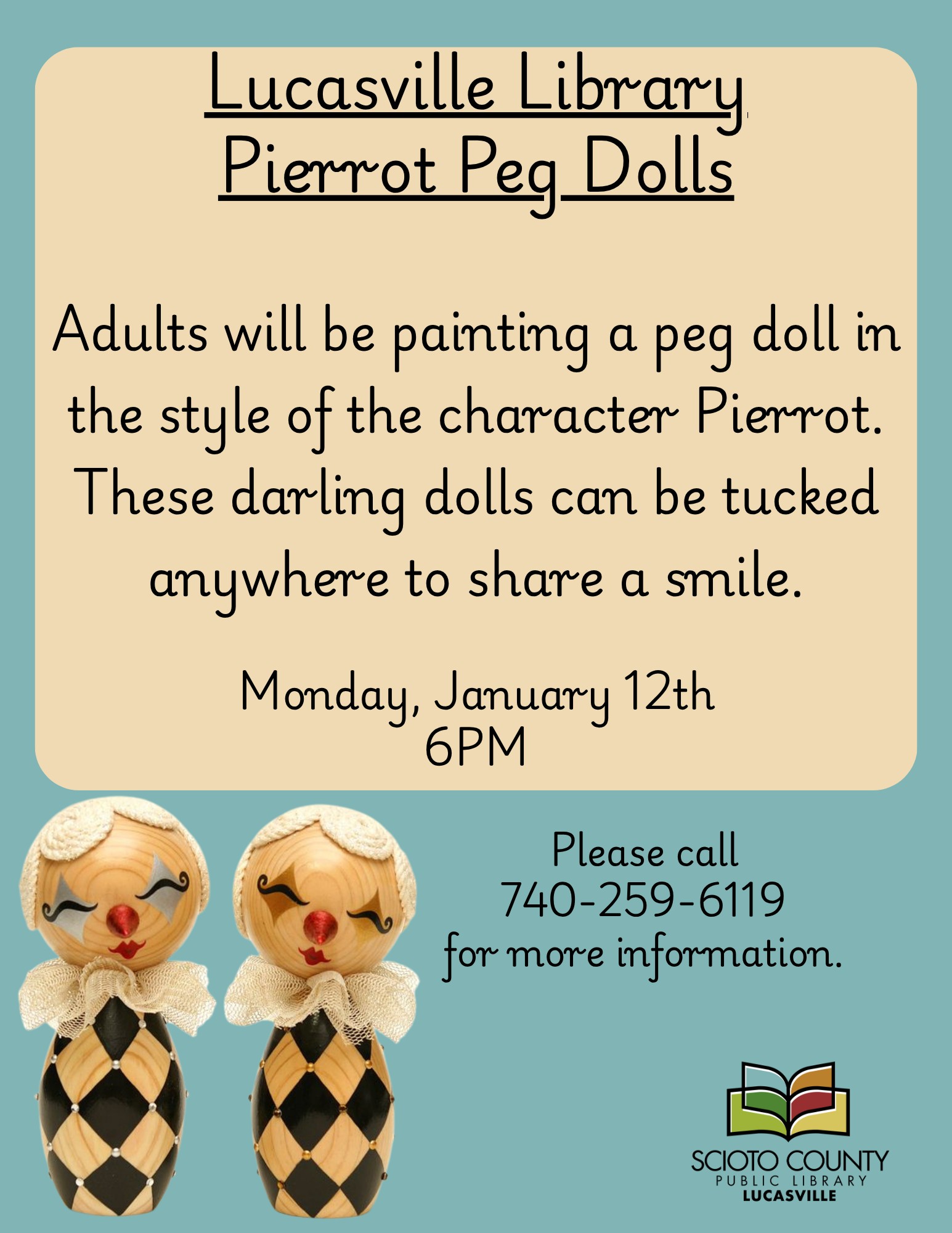 Lucasville Library 103 State Route 728, Lucasville, OH, United StatesThe Lucasville Library will be having a painting craft program for adults on Monday, January 12th at 6pm. Those in attendance will be painting peg dolls in the style of the character Pierrot! For more information, please call 740-259-6119.