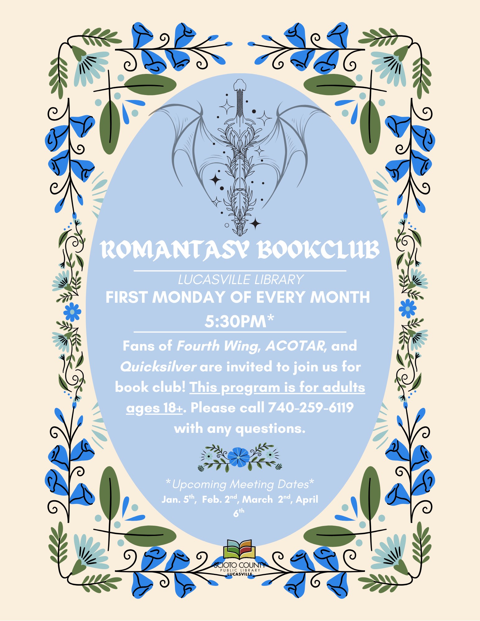 Lucasville Library 103 State Route 728, Lucasville, OH, United StatesAdults are welcome to join us on Monday, February 2nd at 5:30pm for our Romantasy Book Club. Books read and discussed with this reading club will fit into the “romantasy” genre combining romance with fantasy world building storylines. For more information, please call 740-259-6119
