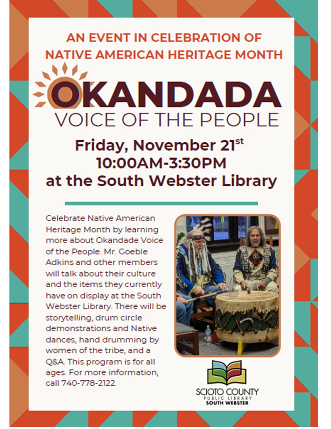 South Webster Library 496 Webster Street, South Webster, OH, United StatesCelebrate Native American Heritage Month by learning more about Okandade Voice of the People. Mr. Goeble Adkins and other members will talk about their culture and the items they currently have on display at the South Webster Library. There will be storytelling, drum circle demonstrations and Native dances, hand drumming...