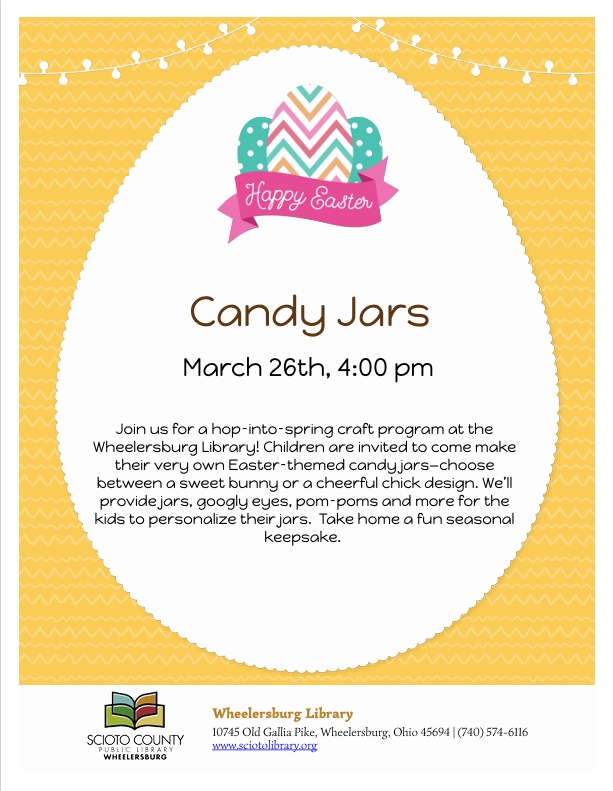 Wheelersburg Library 10745 Old Gallia Pike, Wheelersburg, OH, United StatesJoin us for a hop‑into‑spring craft program at the Wheelersburg Library! Children are invited to come make their very own Easter‑themed candy jars—choose between a sweet bunny or a cheerful chick design. We’ll provide jars, googly eyes, pom‑poms and more for the kids to personalize their jars. Take home a...